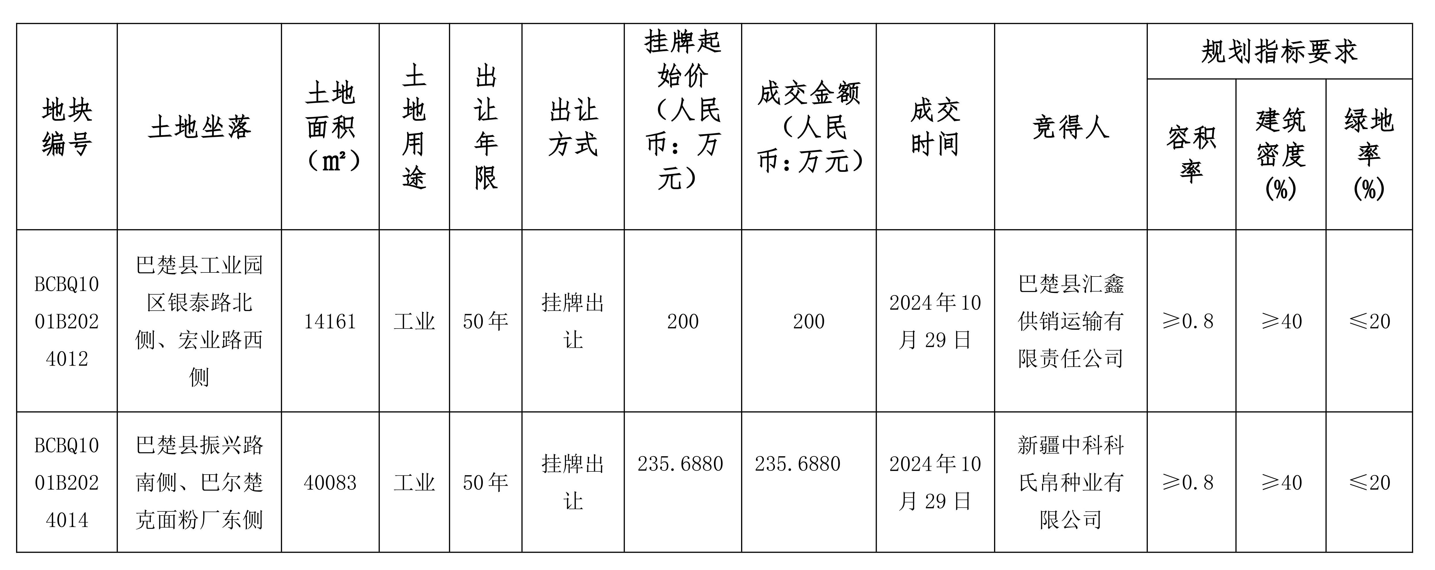 根據(jù)《中華人民共和國土地管理法》《招標拍賣掛牌出讓國有建設用地使用權(quán)規(guī)定》(國土資源部令第39號)《自治區(qū)深化公共資源交易平臺整合共享工作方案的通知》(新政辦函〔2019〕250號)等有關法律法規(guī)及文件的規(guī)定,巴楚縣自然資源局以掛牌方式出讓2(幅)地塊的國有建設用地使用權(quán),現(xiàn)將出讓成交結(jié)果公示如下: