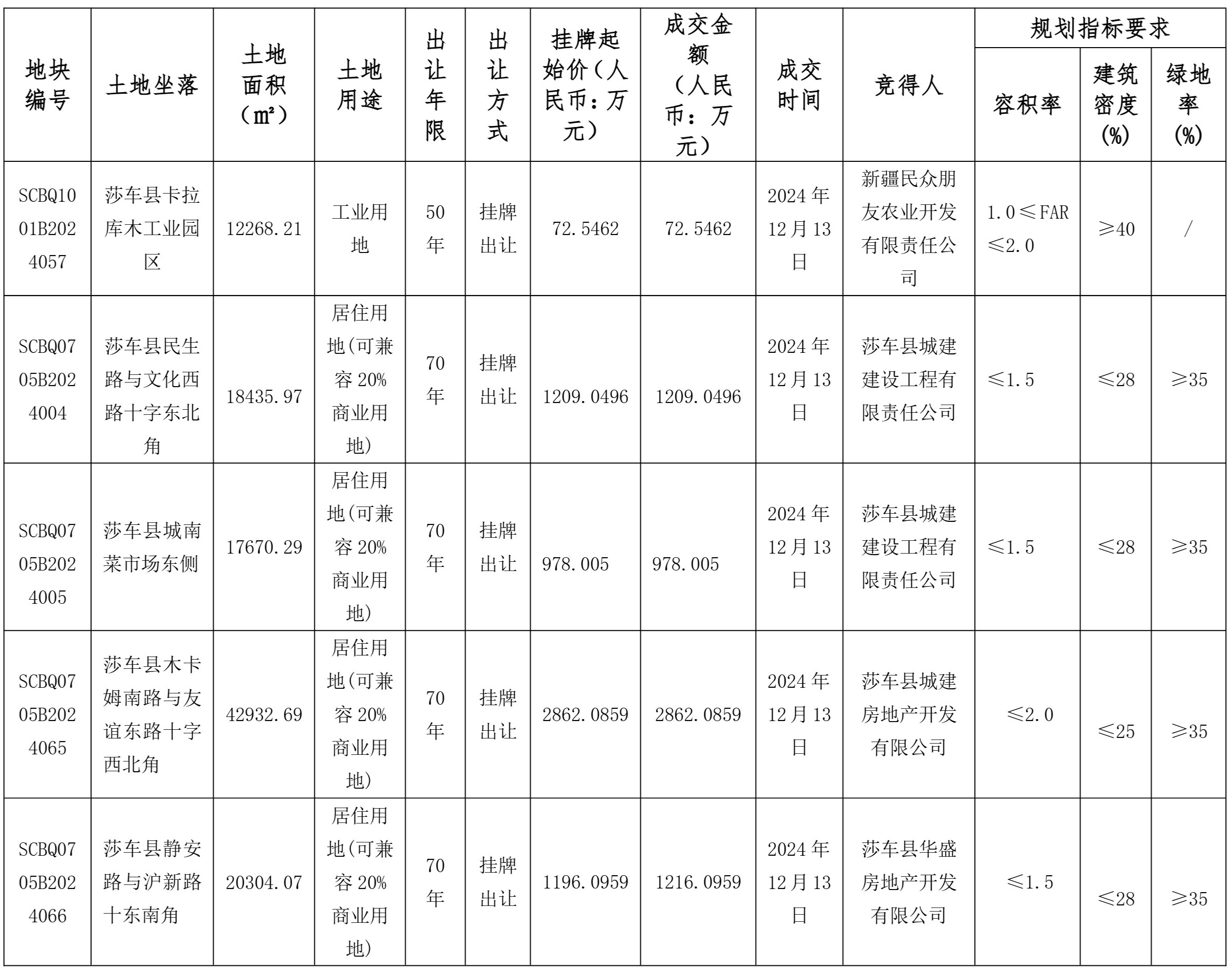 根據(jù)《中華人民共和國(guó)土地管理法》《招標(biāo)拍賣(mài)掛牌出讓國(guó)有建設(shè)用地使用權(quán)規(guī)定》、(國(guó)土資源部令第39號(hào))自治區(qū)人民政府辦公廳轉(zhuǎn)發(fā)自治區(qū)發(fā)展改革委《自治區(qū)深化公共資源交易平臺(tái)整合共享工作方案的通知》(新政辦函〔2019〕250號(hào))等有關(guān)法律法規(guī)及文件的規(guī)定,莎車(chē)縣自然資源局以掛牌方式出讓5(幅)地塊的國(guó)有建設(shè)用地使用權(quán),現(xiàn)將出讓成交結(jié)果公示如下: