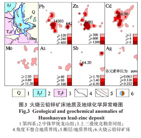 2011年,新疆地礦局第八地質(zhì)大隊(duì)在喀喇昆侖山腹地對(duì) 1∶50 萬(wàn)區(qū)域化探 Hs58-乙 2異常開(kāi)展檢查發(fā)現(xiàn)了火燒云鉛鋅礦,經(jīng)評(píng)價(jià)成為我國(guó)最大、亞洲第二大鉛鋅礦床。礦床產(chǎn)于喀拉昆侖-三江成礦省之林濟(jì)塘Pb,Zn,Cu,Au,Mo、石膏礦帶(Ⅳ級(jí))中,賦礦地層為中侏羅統(tǒng)龍山組。