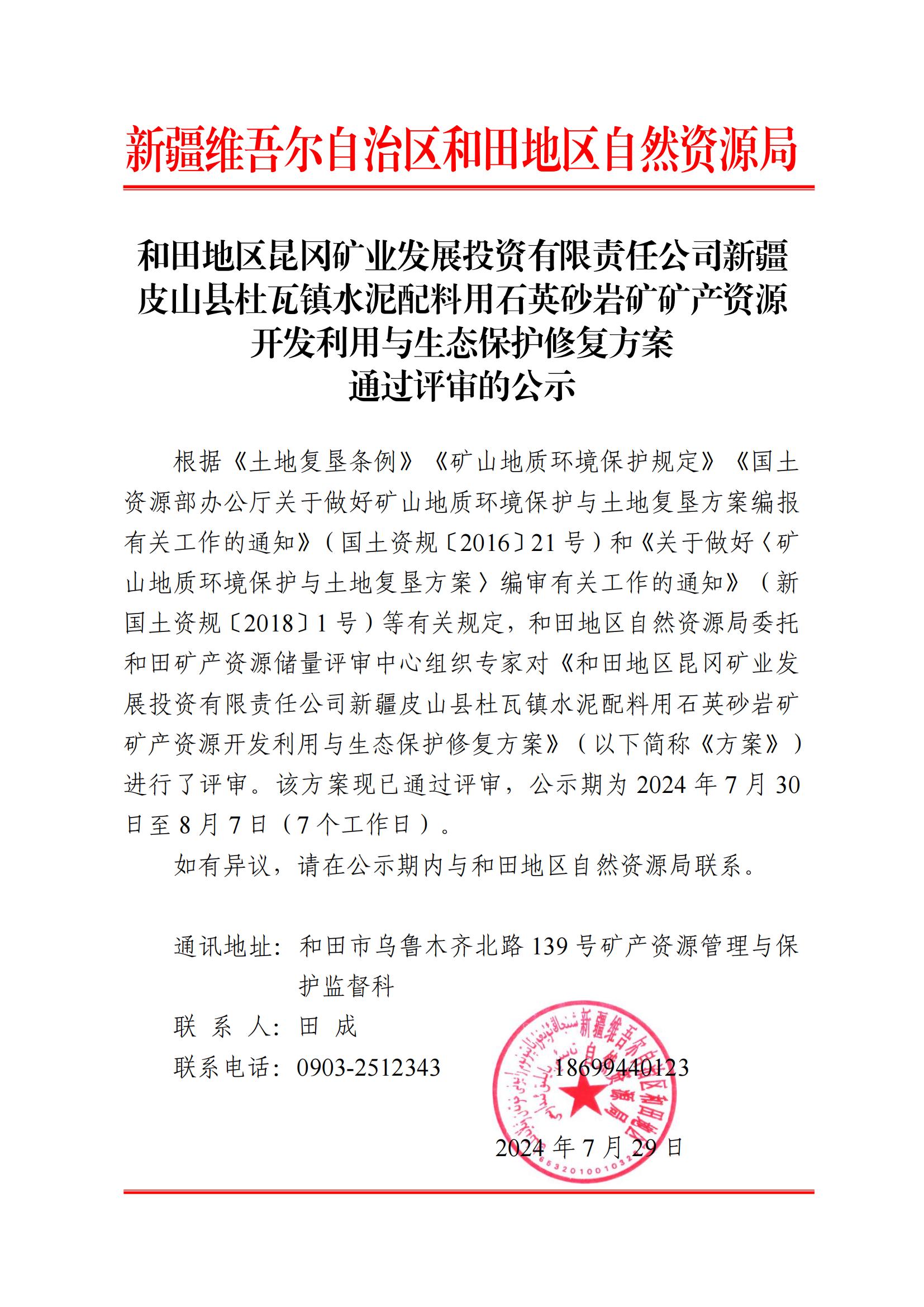 和田地區(qū)昆岡礦業(yè)發(fā)展投資有限責(zé)任公司新疆皮山縣杜瓦鎮(zhèn)水泥配料用石英砂巖礦礦產(chǎn)資源開(kāi)發(fā)利用與生態(tài)保護(hù)修復(fù)方案通過(guò)評(píng)審的公示