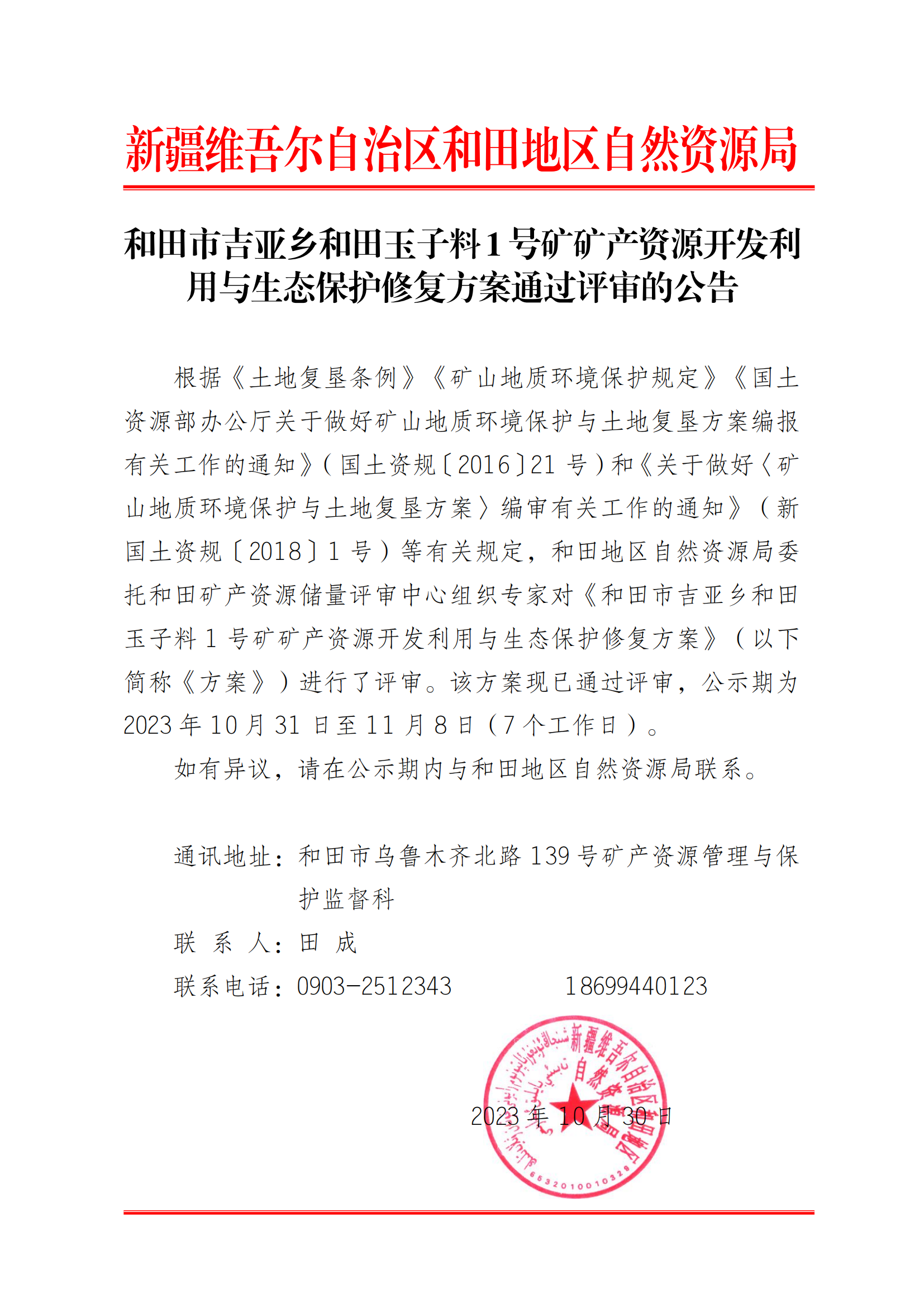 和田市吉亞鄉(xiāng)和田玉子料1號(hào)礦礦產(chǎn)資源開發(fā)利用與生態(tài)保護(hù)修復(fù)方案通過(guò)評(píng)審的公告