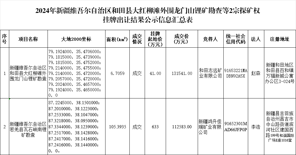 附表:新疆維吾爾自治區(qū)和田縣大紅柳灘外圍龍門山鋰礦勘查等2宗探礦權(quán)掛牌出讓結(jié)果公示信息匯總表