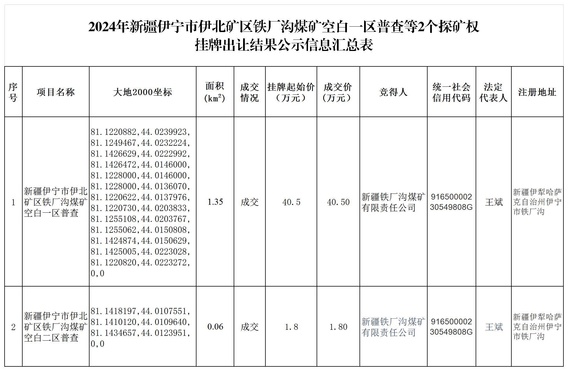 附件:新疆伊寧市伊北礦區(qū)鐵廠溝煤礦空白一區(qū)普查等2個探礦權(quán)掛牌出讓結(jié)果公示信息匯總表