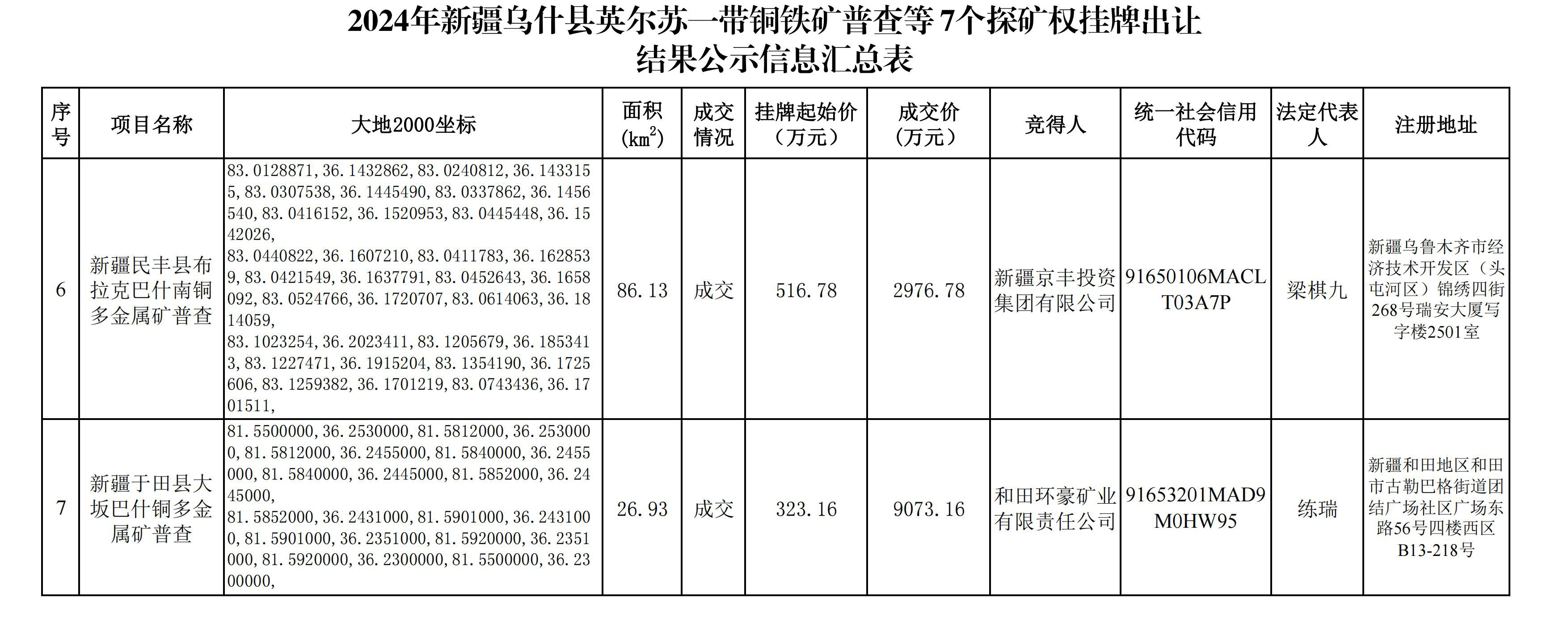 附表:2024年新疆烏什縣英爾蘇一帶銅鐵礦普查等7個(gè)探礦掛牌出讓結(jié)果公示信息匯總表