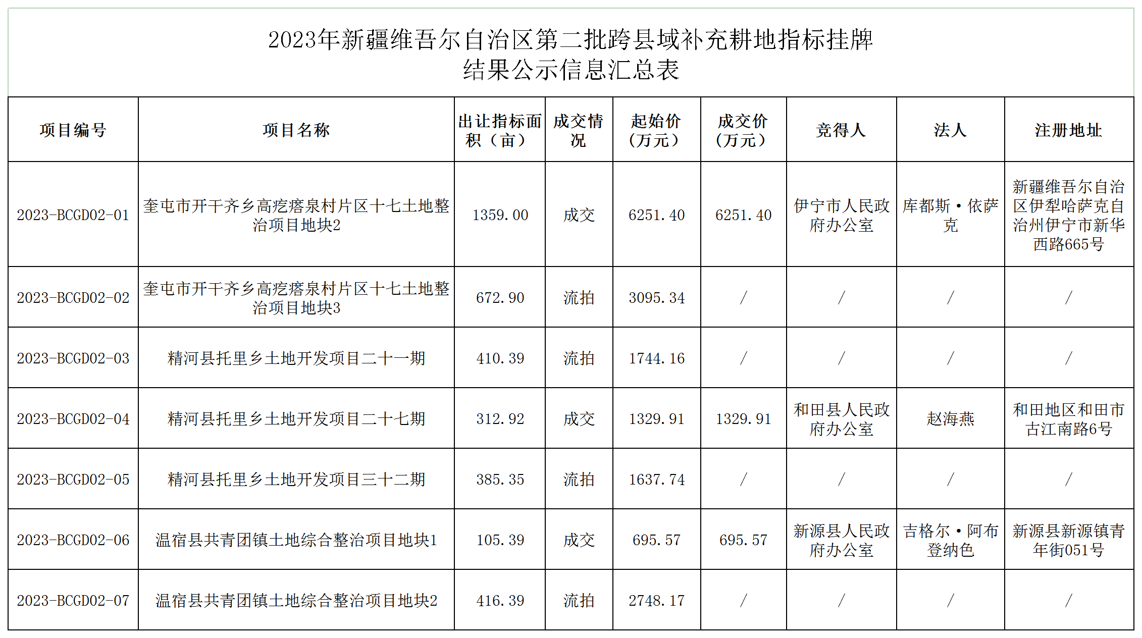 2023年12月20日,按照《2023年新疆維吾爾自治區(qū)第二批跨縣域補充耕地指標掛牌交易公告》(2023-BCGD02),2023年自治區(qū)第二批跨縣域補充耕地指標掛牌在新疆維吾爾自治區(qū)政務(wù)服務(wù)和公共資源交易中心以網(wǎng)上掛牌交易方式成交。根據(jù)有關(guān)規(guī)定,現(xiàn)對該指標交易有關(guān)事項進行公示(具體內(nèi)容見附表)。