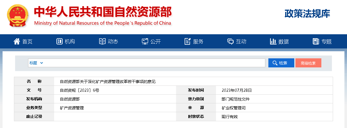 本意見自印發(fā)之日起實施,有效期五年?!蹲匀毁Y源部關(guān)于推進礦產(chǎn)資源管理改革若干事項的意見(試行)》(自然資規(guī)〔2019〕7號)同時廢止。本意見實施前已印發(fā)的其他文件與本意見規(guī)定不一致的,按照本意見執(zhí)行。