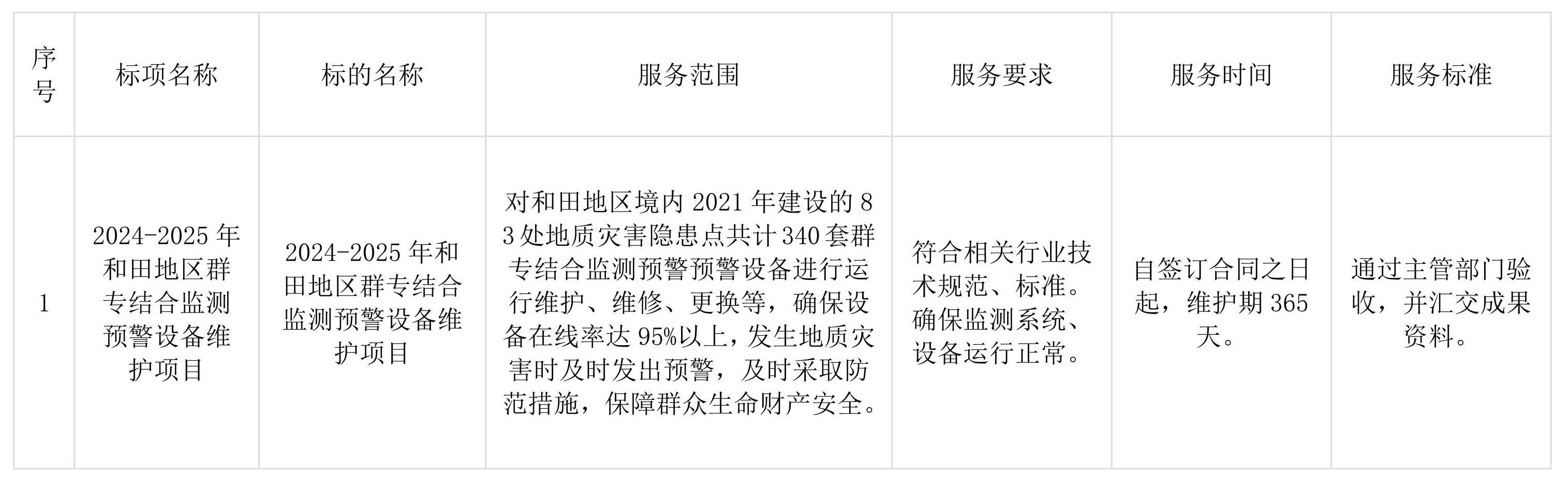 二、項目名稱: 2024-2025年和田地區(qū)群專結(jié)合監(jiān)測預(yù)警設(shè)備維護(hù)項目