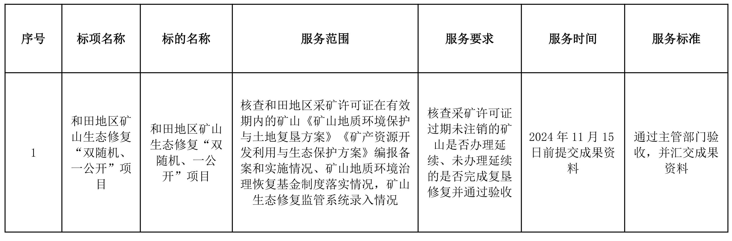 二、項(xiàng)目名稱: 和田地區(qū)礦山生態(tài)修復(fù)“雙隨機(jī)、一公開”項(xiàng)目