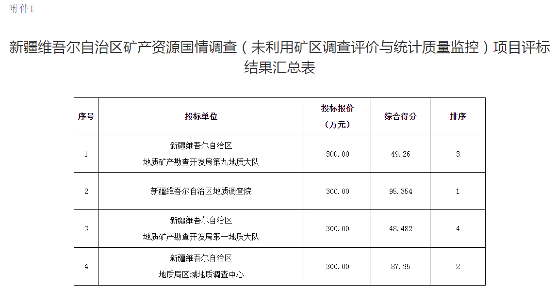 1.新疆維吾爾自治區(qū)礦產(chǎn)資源國(guó)情調(diào)查(未利用礦區(qū)調(diào)查評(píng)價(jià)與統(tǒng)計(jì)質(zhì)量監(jiān)控)項(xiàng)目評(píng)標(biāo)結(jié)果匯總表